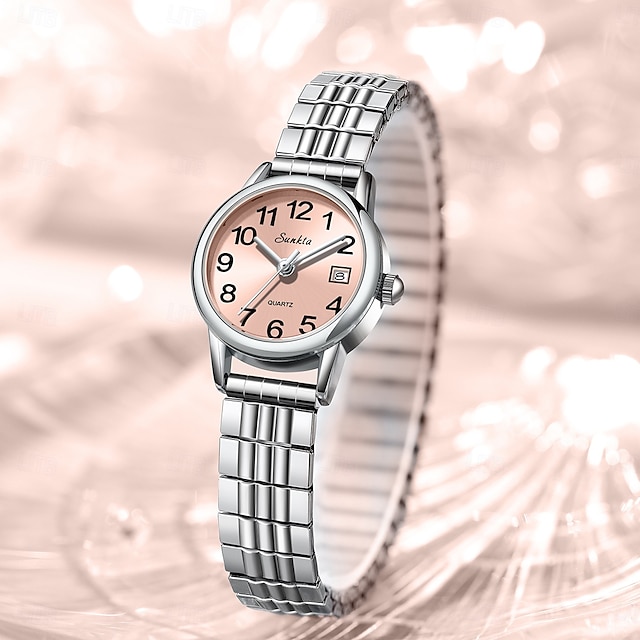 Montre femme avec bracelet élastique en acier, montre à quartz facile à lire avec cadran rose et affichage de la date, bracelet extensible en acier inoxydable, cadeau idéal pour femme ou jeune fille, #14235831