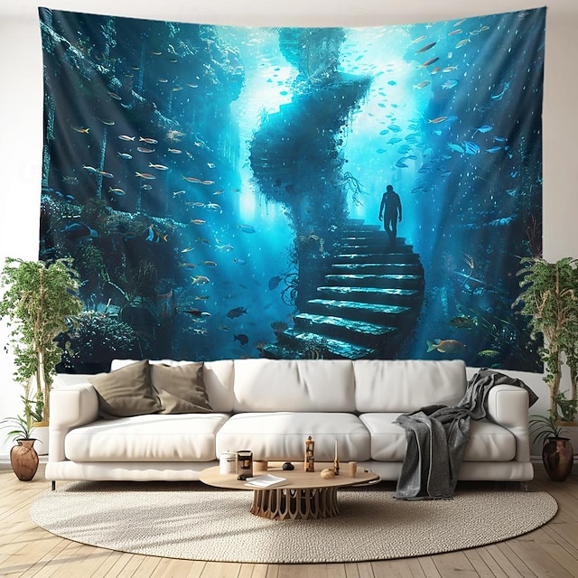 [Design :] La tapisserie présente un paysage sous-marin fascinant, mis en valeur par un escalier en spirale mystique et entouré d'une vie aquatique vivante. Les teintes bleues frappantes et les détails complexes des poissons et de la flore créent une atmosphère sereine mais aventureuse, transformant n'importe quelle pièce en un sanctuaire inspiré de la nature.