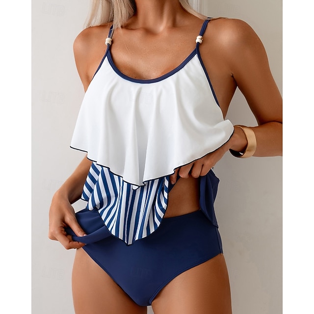 Femmes Maillot de bain Tankini 2 Pièces Rayures Patchwork Jambe courte Séchage Rapide Élastique Sans manches Maillot de Bain Maillot de bain Surf Plage Natation Été#19802843