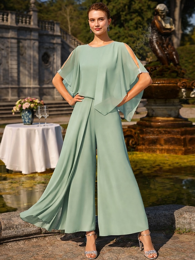 Combinaisons Longueur cheville Robe de Mère de Mariée Sans manches Col Rond Élégant Fête Formel robe demoiselle d honneur Chiffon avec Perlage