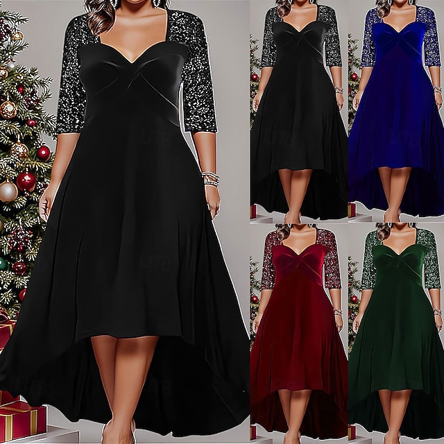 Robe à sequins grande taille pour femmes Couleur unie Col en V Manches 3/4 Printemps Automne Élégante Robe midi Fête Invité de mariage #19331700