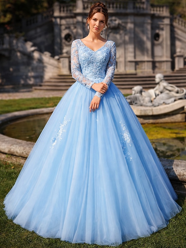 Robe de Bal Longueur Plancher Robes de Promo Princesse Bouffante Manches Longues Col en V Performance Quinceanera avec Cristaux Appliqués #9514411