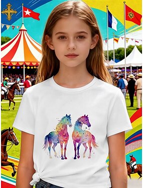 100% Coton Derby du Kentucky Enfants Fille Blanche Graphique Cheval T-shirt Col Rond Manche Courte Vacances Sport & Loisir Tenue Quotidienne Vacances Mode Occasionnel Impression Été