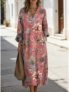 Femmes Robe Midi Robe fourreau Occasionnel Quotidien Sortir Coupe Ample Fleuri Graphique Tropical manche longue Col en V Bleu Rose Claire Rouge Été Printemps