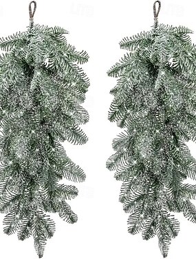Guirlande de 2 pièces en forme de larme, effet neige artificielle, 67 cm (26,37 pouces), style pin Norfolk blanc givré, texture pin réaliste, plastique durable, idéale pour les encadrements de portes,