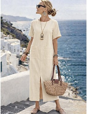 Robe longue en faux coton et lin pour femme, coupe droite, idéale pour l'été, décontractée et quotidienne, manches courtes, col rond, rouge, vert armée, bleu foncé, abricot, été