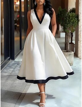 Femmes Robe Midi Robe trapèze Élégant Fête cocktail Extérieur Soirée Mariage Patchwork Avec Poches Coupe régulière Couleur Unie Sans manches Col en V Blanche