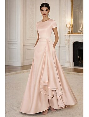 Ligne A Asymétrique Longueur au sol Robe de Soirée Tenue de soirée Élégant Soyeux Manche Courte Col ras du cou Mariage Formel Poche Satin Dos Bénitier avec Fleur brodée Plis Volants
