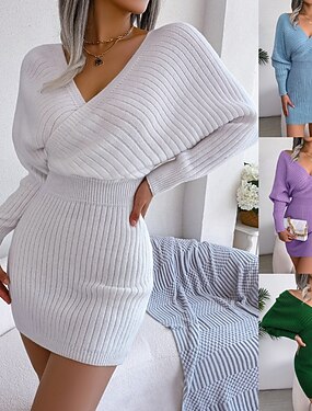 Femmes Pull Robe pull Occasionnel Doux Couleur Unie Côtelé Col en V Tricoté manche longue Hauts Longs Tricoter Extérieur Soirée Quotidien Noir Blanche Printemps Automne