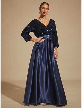 Fourreau Colonne Longueur au sol Robes à paillettes Robe de Mère de Mariée manche longue Col en V Élégant Satin Pailleté avec Ceinture / Ruban