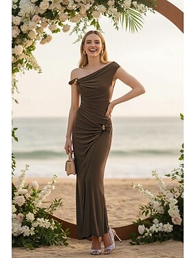 Fourreau Colonne Longueur cheville Robe d'invité de mariage Robes pour invités de mariage Élégant Quotidien Sans manches Une Épaule Fête de jardin Mariage avec Froncé