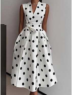 Femmes Robe Midi Robe Décontractée Robe de travail Robe à pois Élégant Mode Moderne Extérieur Vacances Sortir Coupe régulière Pois Sans manches Col en V Noir Blanche Été Printemps