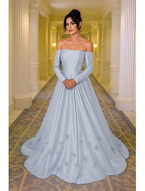 Ligne A Traîne Balayage Robe de Soirée Élégant Soyeux manche longue Épaules Dénudées Mariage Formel Poche Satin avec Cristaux
