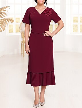 Fourreau Colonne Longueur thé Robe de Soirée Robe de Cocktail Robe d'invité de mariage Robe de Mère de Mariée Manche Courte Col ras du cou Élégant Formel Soirée Formelle Fête de mariage avec Perlage