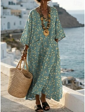 Femmes Robe Midi Robe trapèze Vacances Occasionnel Boho Soirée Coupe régulière A Ombre Fleuri Graphique Manche 3/4 Col en V Bleu Orange Été Printemps Automne