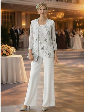 Combinaison Tailleur-Pantalon Trois Pièces Longueur au sol Robe de Mère de Mariée Manche 3/4 Col carré Élégant Formel robe demoiselle d honneur Chiffon Pailleté avec Paillettes Appliques