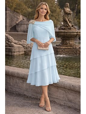 Ligne A Longueur thé Robe d'invité de mariage Robe de Mère de Mariée Demi Manches Col Bateau Élégant Formel robe demoiselle d honneur Réunion de famille Chiffon Echarpe incluse avec Perlage Volants