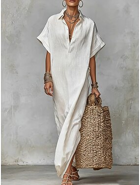Robe longue 100 % coton pour femme, robe d'été, robe caftan, robe blanche, basique, décontractée, pour tous les jours, en extérieur, coupe ample, unie, manches mi-longues, col rond, vert armée, noir, blanc, bordeaux, été, printemps, automne