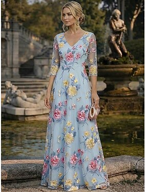 Ligne A Robe Longueur au sol Robe de Mère de Mariée Manche 3/4 Col en V Élégant Luxueux Formel robe demoiselle d honneur Semi-Formel Organza Jacquard avec Bloc de Couleur