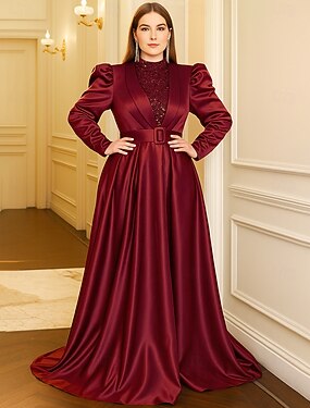 Ligne A Longueur au sol Robe d'invité de mariage Robe de Cérémonie Robe de soirée Robe de Mère de Mariée manche longue Col ras du cou Élégant ancien Grande taille Soirée Formelle Fête de mariage avec