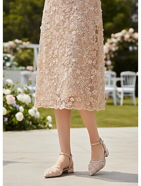 Chaussures d'invitée de mariage pour femme, couleur chair, à talons carrés brodés - élégantes chaussures à bride cheville, parfaites pour les mères assistant à des mariages en ville