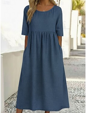 Femmes Robe Midi Robes en lin ancien Classique Quotidien Plage Coupe Ample Uni Demi Manches Col ras du cou bleu marine Vert Kaki Été