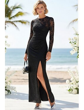 Fourreau Colonne Longueur au sol Robe d'invité de mariage Robe de soirée Robes pour invités de mariage Élégant Fête manche longue Col ras du cou Bal de promo Soirée avec Dentelle Paillettes Fente