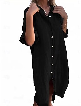 Femmes Robe Midi Faux coton lin Robe Chemise Robe Décontractée Basique Moderne Quotidien Week-end Coupe Ample Uni Manche 3/4 Col en V Bleu Noir Rose Claire Vin Été Printemps