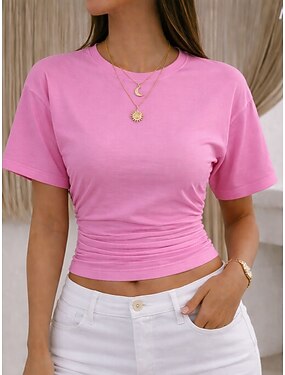 Femmes T-shirt Froncé Couleur Unie Uni Mode Élégant Classique Manche Courte Col ras du cou Col rond Hauts courts Occasionnel Quotidien Sortir Marron Sapin Noir Blanche Rose Claire Vin Été Printemps