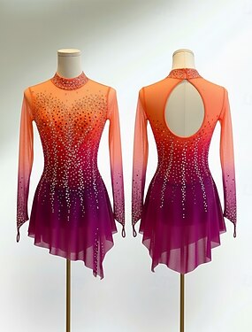Robe de patinage artistique Femmes Patinage Robe Violet Jaune Rouge Patchwork Trou de pouce Haute Élasticité Entraînement Compétition Tenue de Patinage Classique cristal pailleté manche longue