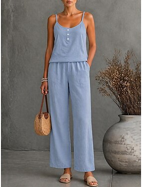 Ensemble débardeur et pantalon 100 % coton pour femme, sans manches, boutonné sur le devant, idéal pour une tenue décontractée au quotidien ou une sortie, bleu, blanc, gris, été, coupe ample