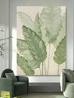 Peinture à l'huile artisanale sur toile, décoration murale abstraite texturée représentant des plantes vertes et des feuilles de bananier. Décoration idéale pour le salon, l'entrée ou le hall