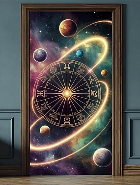 Décoration murale astrologique pour porte : roue du zodiaque, planètes, galaxie, nébuleuse, ciel étoilé, ciel mystique, chambre, salle de méditation, entrée.