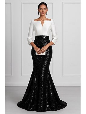 Sirène Trompette Longueur au sol Robes de Bal Robe de Soirée Tenue de soirée Élégant Bloc de Couleur Scintillant manche longue Col en V Mariage Formel Satin Pailleté avec Paillettes