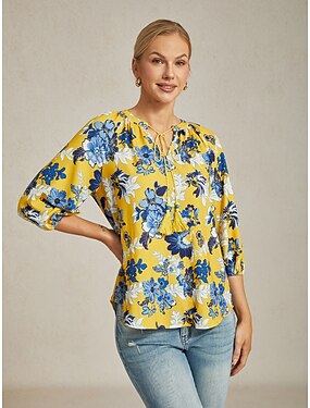 Femmes Féminin Chemise Décontractée Floral Occasionnel Tee-shirt Jaune Floral Manche 3/4 Vacances Col en V