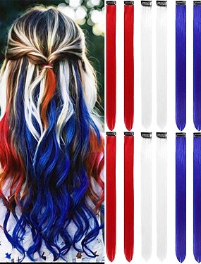 Lot de 12 extensions de cheveux lisses à clips rouges, blanches et bleues, mèches synthétiques colorées de 56 cm (22 pouces) avec reflets néon, accessoires de cheveux arc-en-ciel pour femmes.