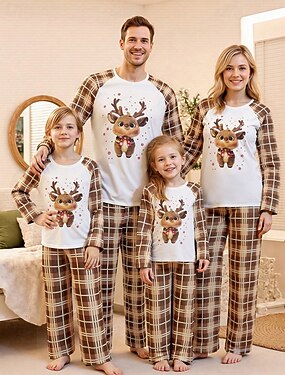 Famille Noël Pyjama de Noël en famille Pyjamas Ensembles de famille Graphique Plaid Cerf Maison Imprimé Marron manche longue Quotidien Tenues assorties