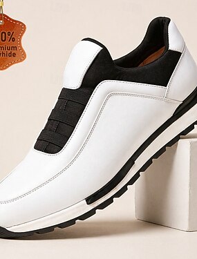 Baskets blanches en cuir pour homme, à enfiler, avec détails noirs, chaussures décontractées basses et légères, confortables et respirantes pour un usage quotidien, la marche et les sorties du week-end.