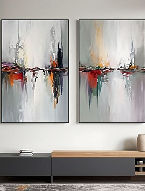 Lot de 2 grandes œuvres d'art murales originales : peinture abstraite grise, peinture texturée blanche sur toile rouge, peinture texturée noire, art mural abstrait moderne
