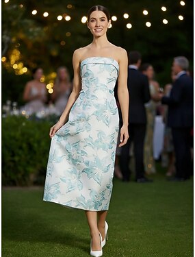 Ligne A Fourreau Colonne Longueur thé Robe d'invité de mariage Robe de Cérémonie Robe de soirée Robes de Bal Élégant Sans manches Sans bretelles Bal de promo Formel Jacquard Dos Bénitier avec Imprim