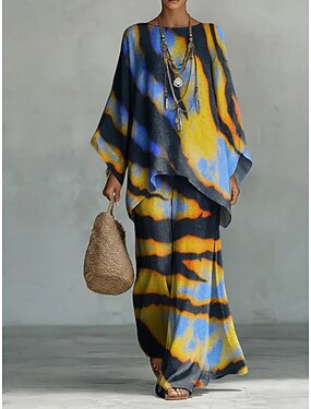 Femmes Chemise Ensembles en coton et lin Ensembles de Pantalons manche longue Manche cloche Col rond Graphique Teinture par nouage Imprimé Vacances Mode Streetwear Occasionnel Quotidien Extérieur