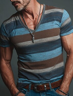 T-shirt homme vintage chiné à rayures horizontales multicolores bleues et marron, imprimé intégral, col V, coupe ajustée, style décontracté au quotidien. Tailles S, M, L, XL, XXL, XXXL.