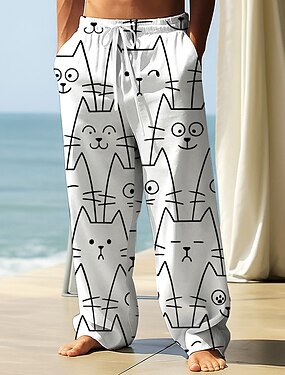 Homme Pantalons Pantalon décontracté Pantalons Amples Taille élastique avec cordon de serrage Pantalon en lin avec poches Animal Chat Drôle Longueur complète Extérieur Vacances Occasionnel Blanche