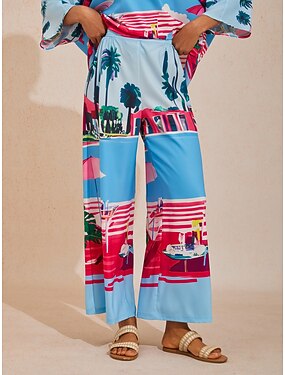 Pantalon droit en satin soyeux, palmiers, nuit d'été