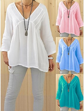 Femmes Chemisier Chemise en coton Faux coton lin Froncé Couleur Unie Élégant Occasionnel manche longue Col en V Hauts Réguliers Quotidien Bleu Blanche Rose Claire Vert Été Printemps Automne