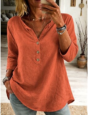 Femmes Chemisier Faux coton lin Dentelle Boutons Couleur Unie Élégant Occasionnel Manche 3/4 Col en V Hauts Réguliers Quotidien Bleu Noir Blanche Rose Claire Orange Printemps Automne