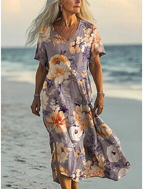 Femmes Robe maxi Robe trapèze Occasionnel Quotidien Coupe Ample Fleuri Graphique Manche Courte Col en V Bleu Jaune Violet Vert Été Printemps