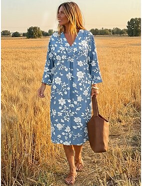 Femmes Robe Midi Robe Décontractée Robe trapèze Vacances Occasionnel Boho Plage Soirée Coupe Ample Fleuri Graphique manche longue Col en V Bleu Jaune Rose Claire Violet Été Printemps