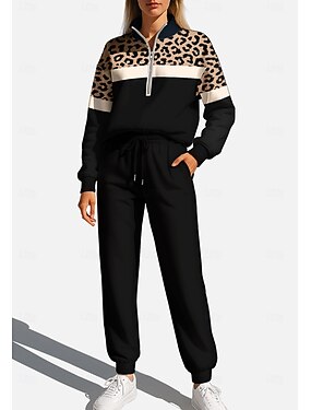 Femmes Sweat-shirt Ensemble Survetement Survêtement Cordon de serrage Fermeture éclair Léopard Veste et Pantalon de Jogging Ensemble de vêtements de sport Printemps Automne Hiver Noir avec blanc