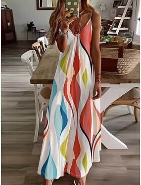 Femmes Robe maxi Robe d'Été Robe trapèze Robe Nuisette Vacances Occasionnel Boho Plage Coupe Ample Graphique Abstrait Sans manches Col en V Orange Été Printemps